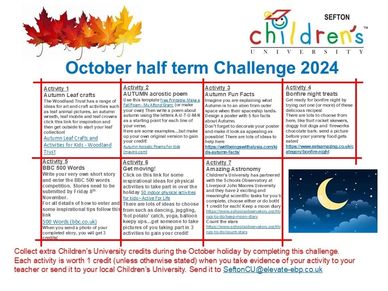 Children can collect extra Children’s University credits during the October holiday by completing the half term holiday challenge. Each activity is worth 1 credit (unless otherwise stated) when you bring evidence of your activity to your school or send it to our local Children’s University - SeftonCU@elevate-ebp.co.uk