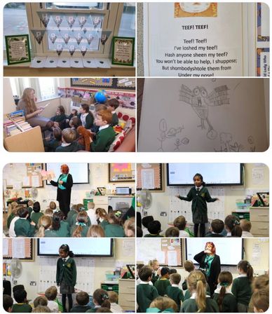 In Year 4, Ms Dalton read 'The Jabberwocky' by C. S. Lewis to the children. They had a go at drawing the beast and a storyboard for the poem. In Year 3 istened to 'This Bear' by Joseph Coelho, Sharuhi performed 'No Hickory, No Dickory, No Dock' by John Agard & everyone said & acted Ken Dodd's 'She Stood on the Bridge at Midnight'.