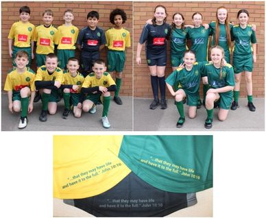 We have received our smart, new football kits. Thank you to the PTA, MH&C Accountancy and Howdens for sponsoring them. We even have our mission statement printed on the back: '..that they may have life and have it to the full.' John 10:10