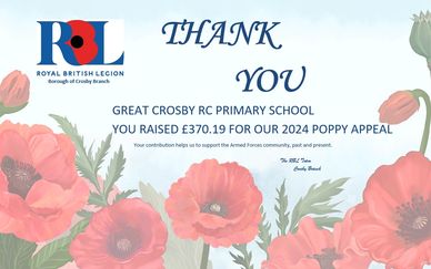 The Crosby Branch of the Royal British Legion has thanked us for our support for the Poppy Appeal. They have loved seeing the displays and the work done by the children. We raised a total of £370.19. The image shows the certificate for the school and we will of course be collecting next year.