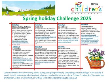 The Children's University Spring Challenge has seven activities for you to gain extra credits during the Easter holidays. Click/tap the image to visit our Children's University page, which has all the links.